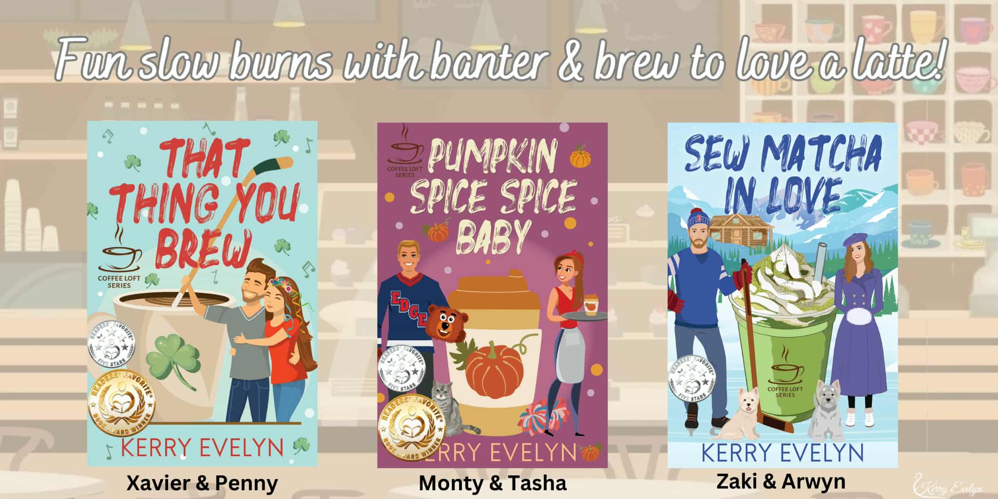 Thank you for visiting KerryEvelyn.com! I’m so glad you’re here! As an Amazon Associate I earn from qualifying purchases. Cranes Cove Moon Mist Manor Once Upon Academy Palmer City Voltage Brewer Brides Coffee Loft Don’t miss my new sports rom-com! That Thing You Brew Pumpkin Spice Spice Baby Sew Matcha In Love Find the Crane’s Cove Series at Amazon Find the Palmer City Voltage Series at Amazon Find the Brewer Brides Series at Amazon Christmas at Moon Mist Manor Love Overrules the Lawyer The Beachcomber’s Buccaneer Bounty NONFICTION Buy Now Read the Review More Nonfiction
